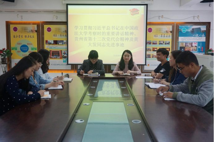 为深学笃用习近平总书记在中国政法大学考察时的重要讲话、《中共贵州省委关于开展向黄大发同志学习活动的决定》等相关文件精神,为全面推进依法治国,加强法治人才培养以及加强和改进高校思想政治工作,2017年5月22日上午,我校团委在大学生活动室召开了“深入学习贯彻习近平总书记在中国政法大学考察时的重要讲话精神、贵州省第十二次党代会精神及黄大发同志先进事迹”座谈会。我校团委书记张婷、副书记傅小芳及校团委全体老师参加了此次座谈会。