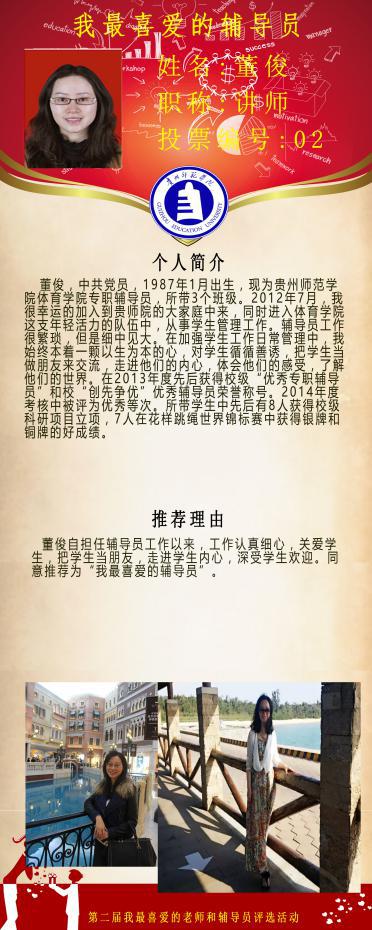 “师者,所以传道授业解惑也”,师者是万千学子成长路途中辛勤的指路人。为弘扬我校师者的优秀品质,树立教书育人典范,增进和谐的师生关系,营造良好的育人环境。贵州师范学院于2015年10月23日-11月20日举行第二届“我最喜爱的老师“、“我最喜爱的辅导员”评选活动。