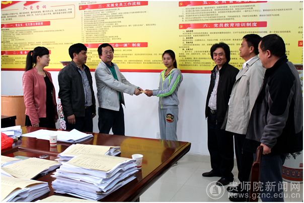 4月初,在全校“学党章、转作风、迎评估”知识竞赛活动中,继续教育学院参赛队了荣膺“二等奖”,继续教育学院经研究,决定奖励参赛队1500元。参赛队的三位同志觉得,这笔资金与其发给个人,不如用来资助贫困的学生。这一提议得到了继续教育学院党委和行政的大力支持。通过调查了解,他们得知地理与旅游学院2012级农业资源与环境专业学生李茜,家住遵义市桐梓县官仓镇朱天村河坝组,父亲李光锦身患癌症,无钱医治,不幸于今年4月18日亡故,撇下妻子和一对儿女,为了医治父亲,她们一家如今已是负债累累,借贷无力,家徒四壁,生活十分窘迫,于是决定将这笔奖金捐给学生李茜。