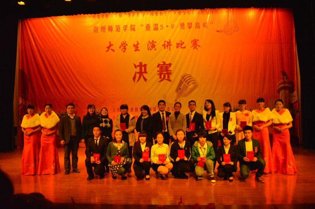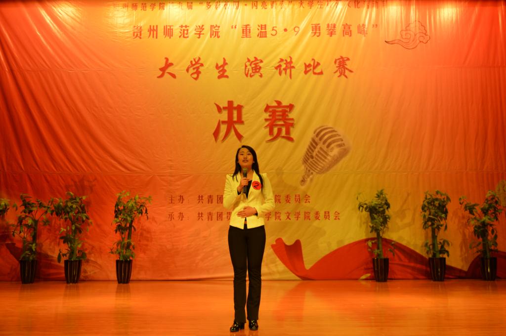 经过学院推选,校级初赛,共了15名选手参加了校级决赛。在文学院院学生会文艺部唯美的舞蹈中比赛拉开了序幕。校党委宣传部部长邹晓青为本次活动致辞,她说今年是习近平同志在贵州大学“5·9”讲话三周年,席书记“5·9”讲话的核心是勉励青年学子立志成才、自强不息、知行合一、勇攀高峰,今晚各位参赛选手围绕主体,是大学生对学习“5.9”讲话精神成果的具体体现,充分地展示现代大学生的风貌和能力。