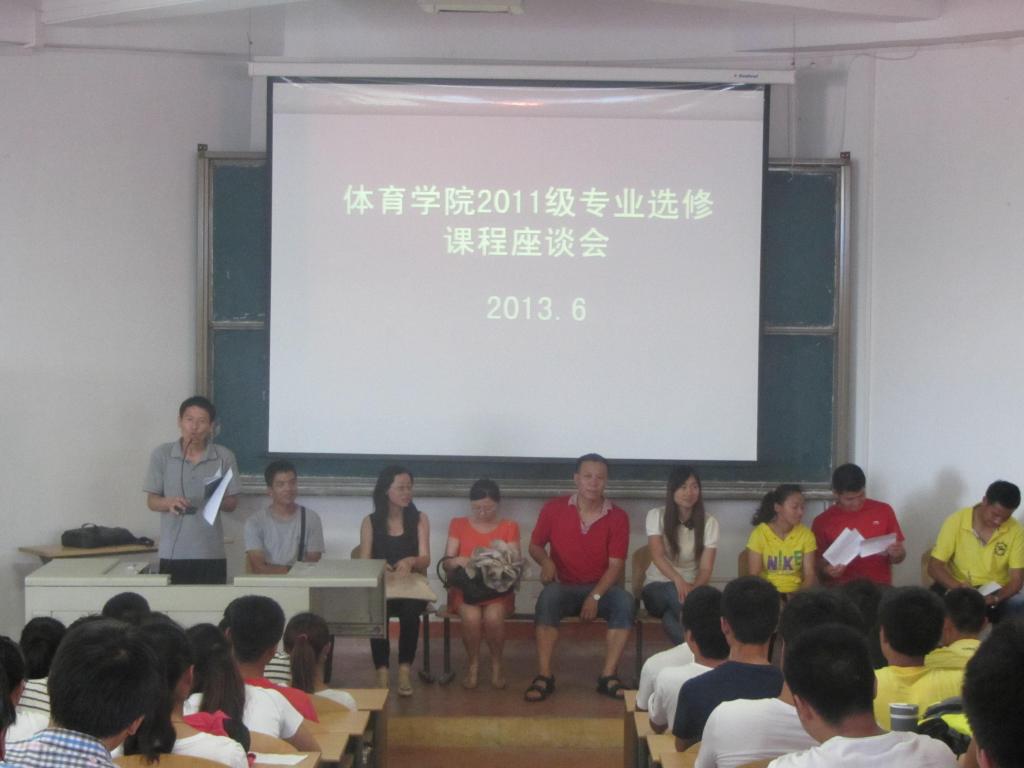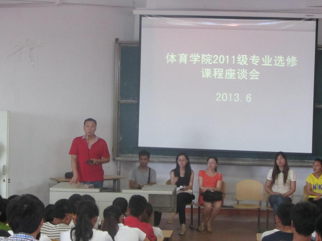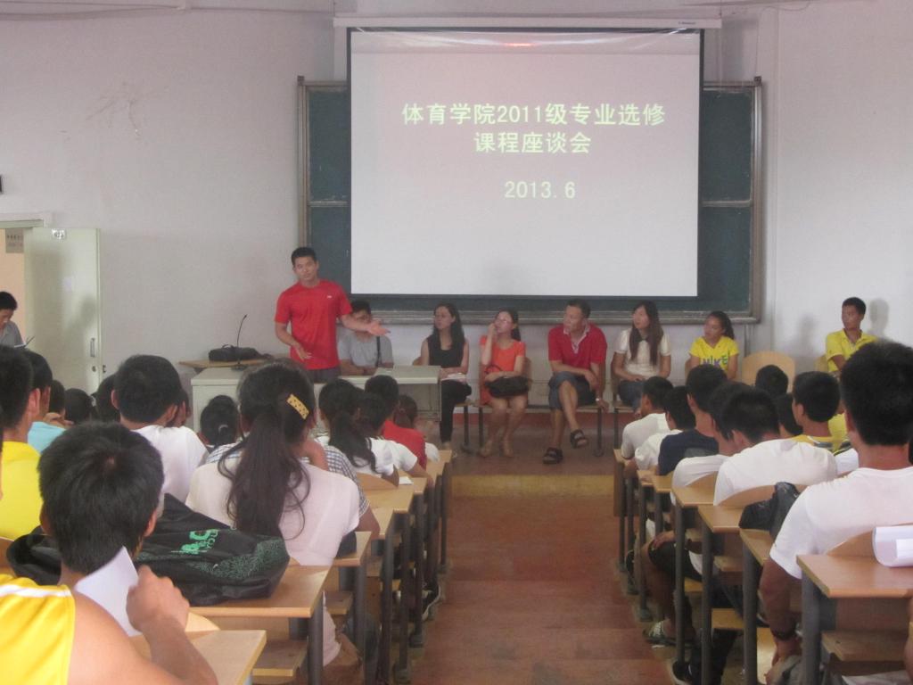 为做好2013学年2011级专业选项课以及专业选修课工作,体育学院于6月17日下午举办了2011级本科学生专业课程开设师生座谈会。参加会议的有体育学院院长黄伟明、办公室主任邬孟君、理论教研室主任陆俊波、专业选修课任课教师及2011级全体同学,会议由术科教研室主任李延武主持。
