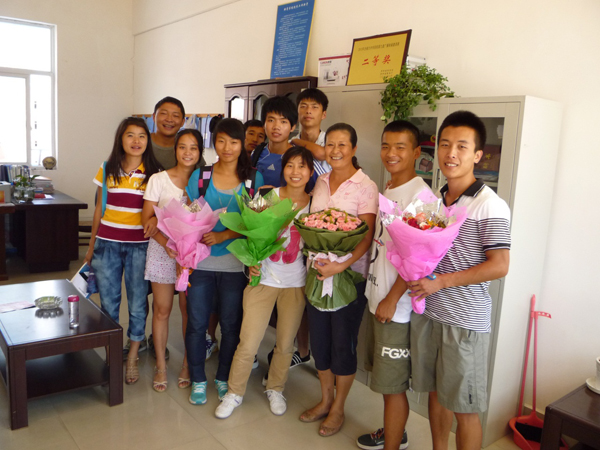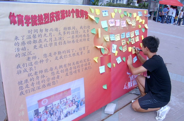 2012年9月10日,晨光明媚,鲜花烂漫,声声祝福开启教师节美好的一天。上午,体育学院3、4班同学们正悄悄地为前来上课的金欢欢老师、董俊、万珍辅导员送出同学们准备的一束花,一声问候,一张洋溢着各班同学真挚情感的贺卡。