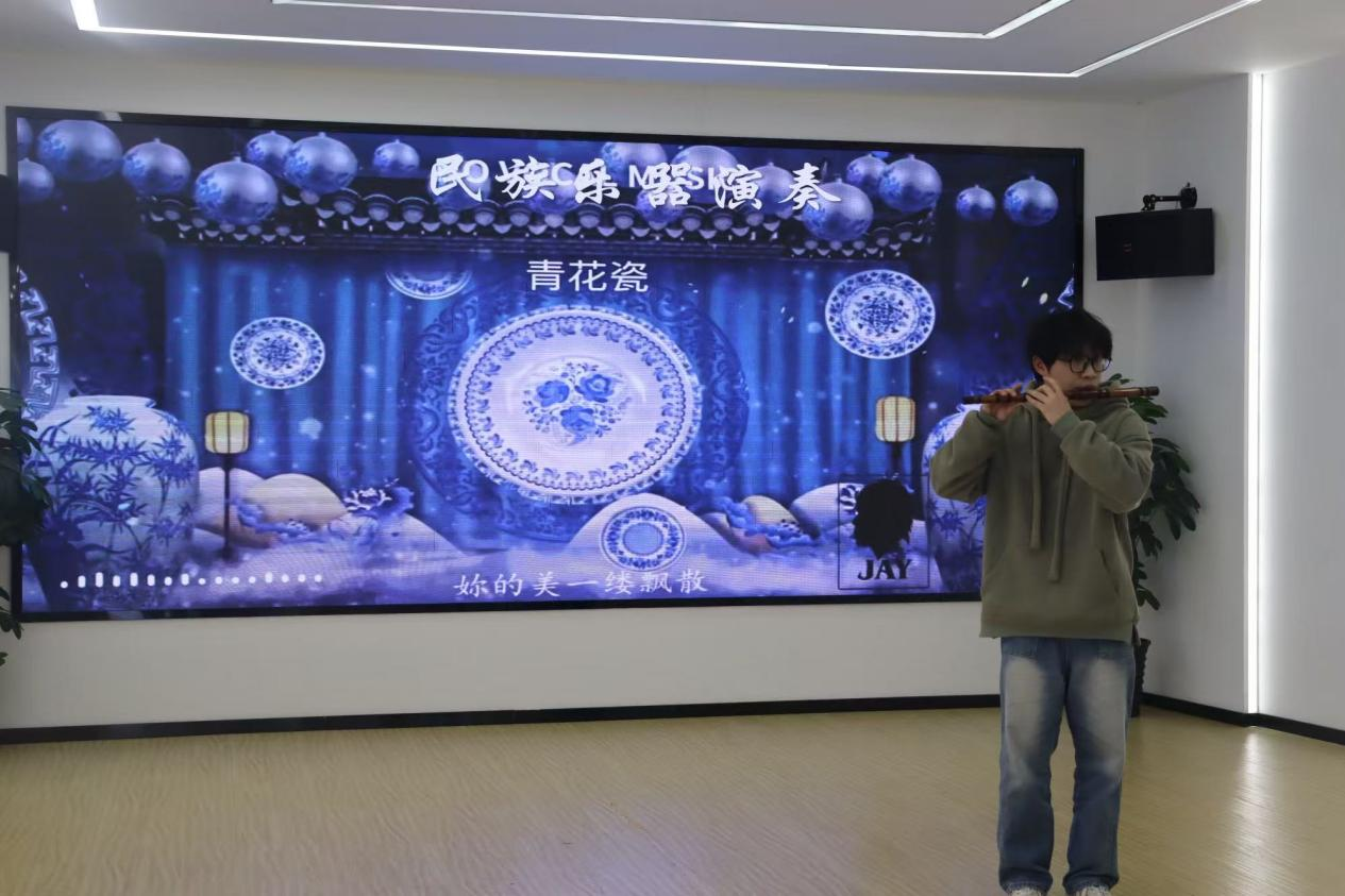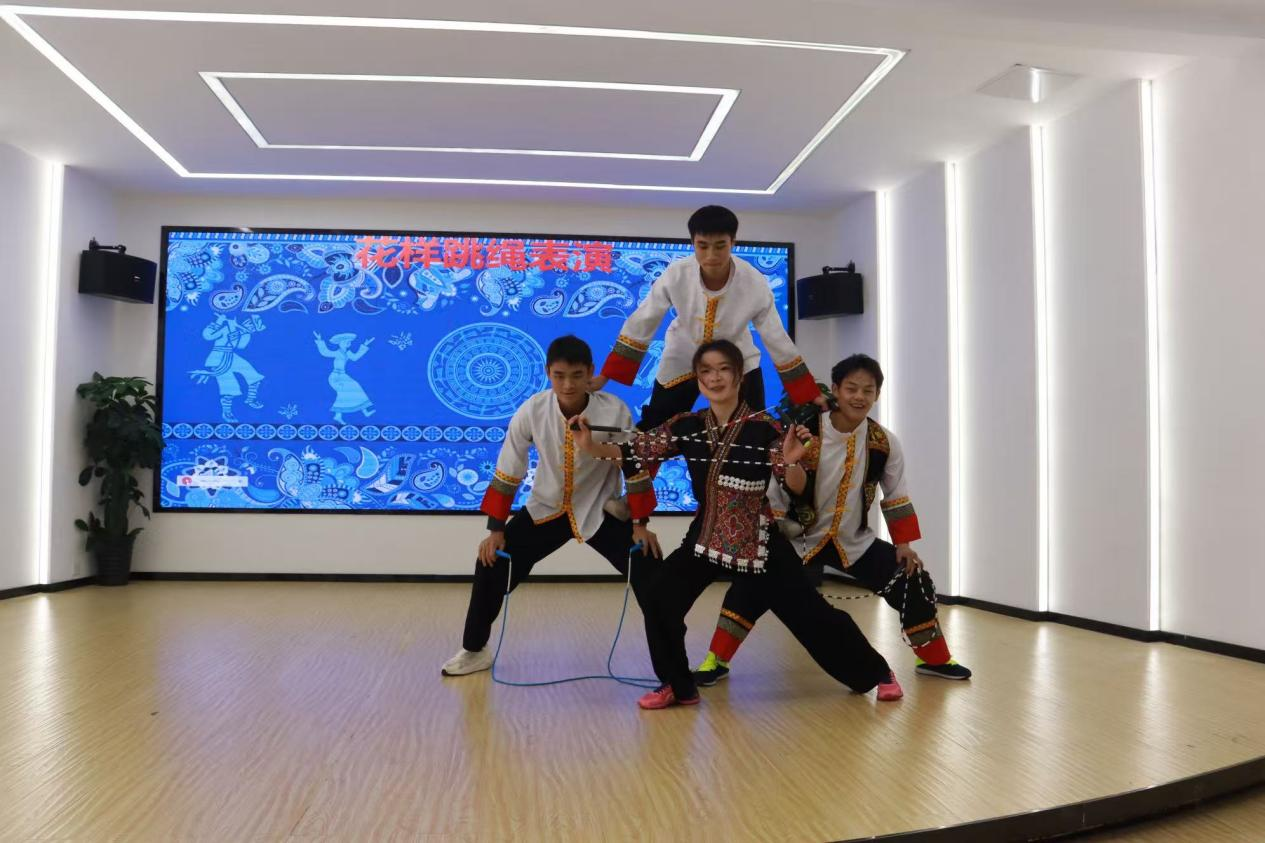 在民族文化交流环节,少数民族同学代表分享了本民族的特色文化与感人故事,增进了大家对多元一体中华民族显著特征的认识。活动还特别安排了民族艺术与体育展示:苗族同学用传统乐器演奏《青花瓷》,悠扬旋律跨越古今,传递出浓浓的民族情谊;舞狮与花样跳绳充分融合了民族元素,为活动带来了不一样的视觉感受。