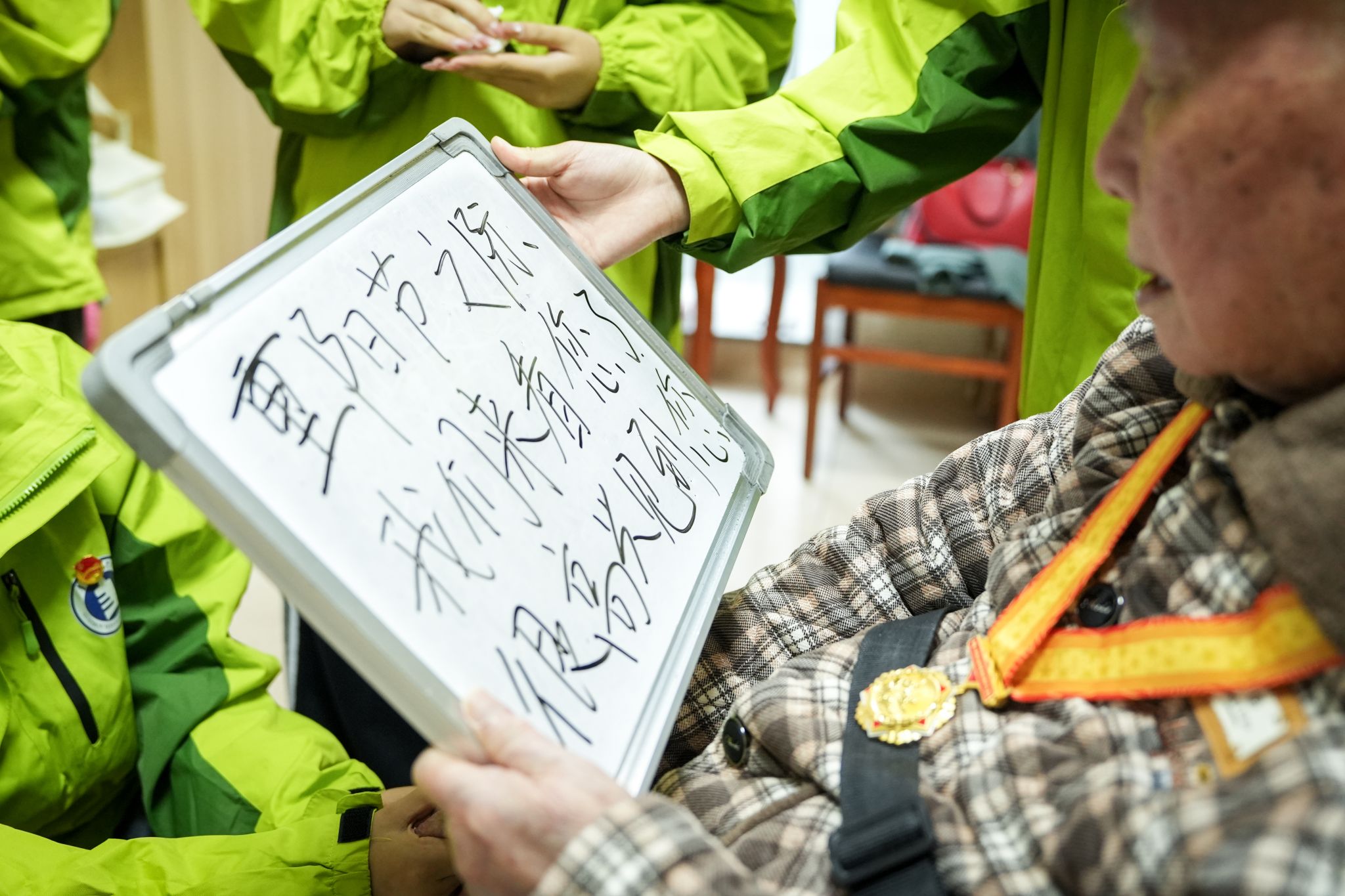 交流时刻满是温情。志愿者们将心底的问候与好奇一笔一划写在白板上,递到爷爷眼前。看到大家的热情,爷爷难掩喜悦,眼中闪烁着光亮,时而认真点头,时而用手势回应,还紧紧握住志愿者的手,仿佛要将这份温暖牢牢传递。那微微颤抖却充满力量的手掌,藏着他对来访众人的欢迎,更藏着历经岁月沉淀的豁达与热忱。