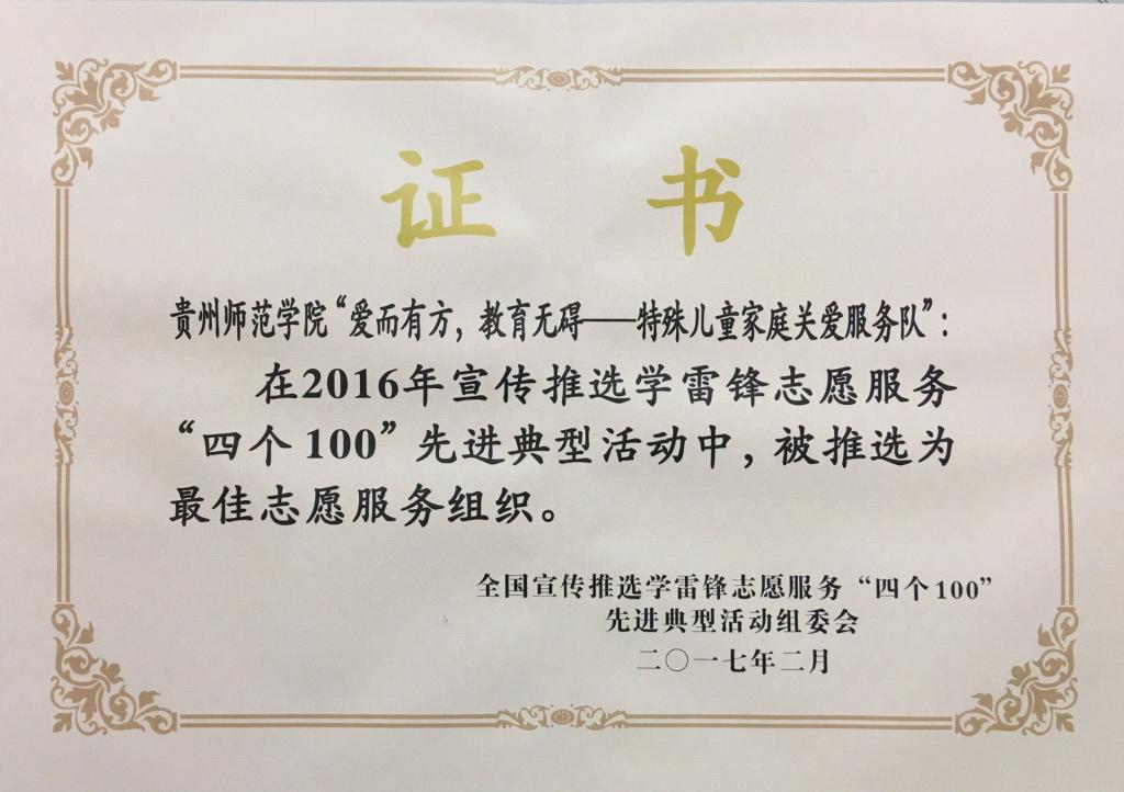 为积极培育和践行社会主义核心价值观,大力弘扬奉献友爱互助进步的志愿精神,进一步推动学雷锋志愿服务制度化常态化,中央宣传部、中央文明办、民政部、环保部、文化部、国务院国资委、全国总工会、共青团中央、全国妇联、中国文联、中国残联,人民日报、光明日报、中央电台、中央电视台共同组织开展2016年宣传推选100个最美志愿者、100个最佳志愿服务组织、100个最佳志愿服务项目、100个最美志愿服务社区活动(以下简称2016年宣传推选学雷锋志愿服务“四个100”先进典型活动)。经过组委会多方评定,我校教育科学学院的“爱而有方,教育无碍——特殊儿童家庭关爱服务队”荣获2016年宣传推选学雷锋志愿服务“四个100”先进典型活动“全国最佳志愿服务组织”,并作为全国获奖典型项目于2017年2月28日在中宣部召开的全国学雷锋志愿服务工作座谈会上予以表彰。